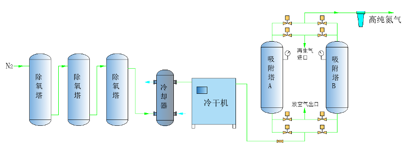 加氢纯化:加氢型氮气纯化采用贵金属钯为催化剂,氮气中的氧气和氢气在一定温度和催化剂中反应生成水并除去而使氮气纯度达到99.9995以上的一种气体纯化方式。它是一种氮气终端纯化装置,其反应方程式为: